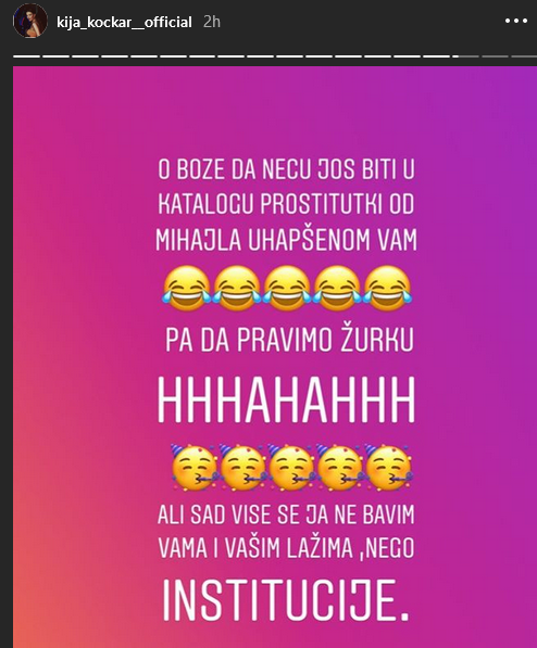 – O bože da neću još biti u katalogu prostitutki od Mihaila uhapšenom vam. Pa da pravimo žurku. Ali sad se ja više ne bavim vama i vašim lažima, nego institucije – napisala je Kija.