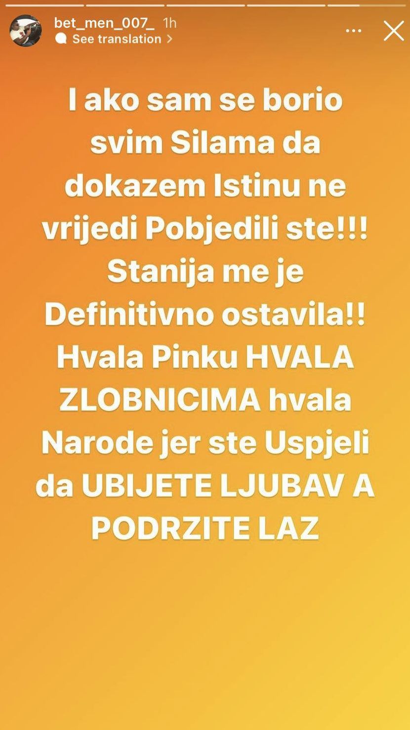 Stanija me je definitivno ostavila. Hvala svim zlobnicima, hvala narode jer ste uspjeli da ubijete ljubav, a podržite laž – napisao je bijesan i razočaran Asmin.