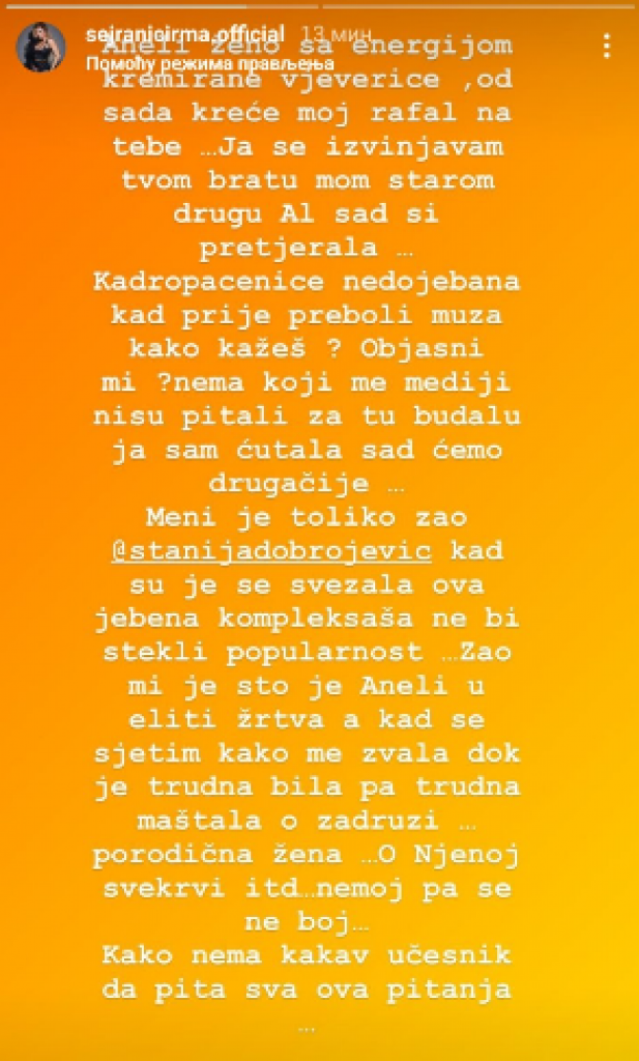 – Aneli ženo sa energijom kremirane veverice, od sada kreće moj rafal na tebe. Ja se izvinjavam tvom bratu, mom starom drugu, ali sad si preterala. Kadropaćenice nedoj*bana, kad pre preboli muža kako kažeš? Objasni mi? Ćutala sam, ali sada ćemo drugačije. Meni je toliko žao Stanije Dobrojević, kad su je se svezala ova j*bena dva kompleksaša, ne bi li stekli popularnost. Žao mi je što je Aneli u Eliti žrtva, a kad se setim kako me zvala dok je trudna bila, pa trudna maštala o Zadruzi. Porodična žena, o njenoj svekrvi, itd… Nemoj, pa se ne boj! Kako nema kakav učesnik da pita sva ova pitanja – napisama je Irma, a potom dodala: