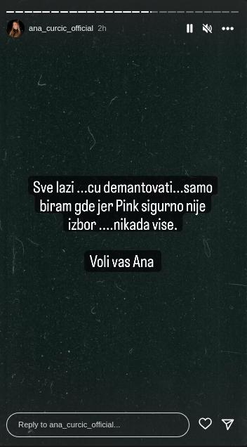 – Sve laži ću demantovati, samo biram gde jer Pink sigurno nije izbor. Nikada više. Voli vas Ana – glasio je Instagram stori u kom je Ana istakla da neće više biti na televiziji čiji su vlasnici Željko i Milica Mitrović, koja je ujedno i idejni tvorac rijalitija “Zadruga” i “Elita”.