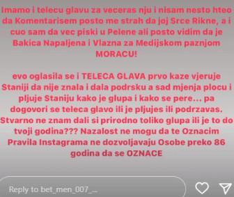 – Evo oglasila se i teleća glava, prvo kaže veruje Staniji da nije znala i dala podršku, a sad menja ploču i pljuje Staniju kako je glupa i kako se pere… Pa dogovori se, teleća glavo, ili je pljuješ ili je podržavaš. Stvarno ne znam da li si prirodno toliko glupa ili je to do tvojih godina? Nažalost, ne mogu da te označim, pravila Instagrama ne dozvoljavaju da se osobe preko 86 godina označe – dodao je on.