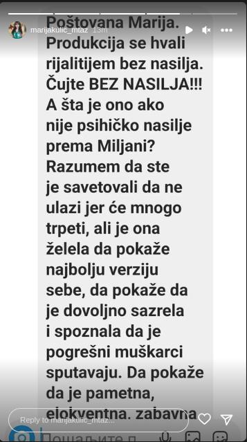 – Produkcija se hvali rijalitijem bez nasilja. Čujte bez nasilja! A šta je ono ako nije psihičko nasilje prema Miljani? Razumem da ste je savetovali da ne ulazi jer će mnogo trpeti, ali je ona želela da pokaže najbolju verziju sebe, da pokaže da je dovoljno sazrela i spoznala da je pogrešni muškarci sputavaju. Da dokaže da je pametna, elokventna i zabavna – glasila je pomenuta poruka.