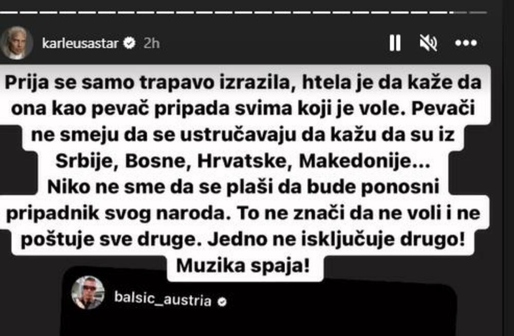 – Prija se samo trapavo izrazila, htela je da kaže da ona kao pevač pripada svima koji je vole. Pevači ne smeju da se ustručvaju da kažu da su iz Srbije, Bosne, Severne Makedonije, Hrvatske…Niko ne sme da se plaši da bude ponosni pripadnik svog naroda. To ne znači da ne voli i ne poštuje sve druge. Jedno ne isključuje drugo – muzika spaja – napisala je Karleuša.