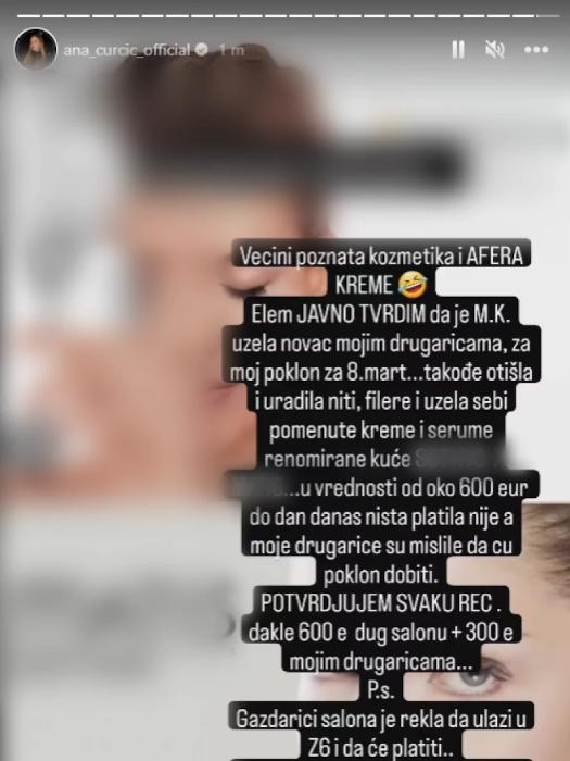 – Većini poznata kozmatike i afera kreme. Elem, javno tvrdim da je M. K. uzela novac mojim drugaricama, za moj poklon za 8. mart. Takođe, otišla i uradila niti, filere i uzela sebi pomenute kreme i serume. U vrednosti od oko 600 evra do dan danas ništa platila nije, a moje drugarice su mislile da ću poklon dobiti. Potvrđujem svaku reč! Dakle, 600 evra dug u salonu plus 300 evra mojim drugaricama. PS. Gazdarici salona je rekla da ulazi u Zadrugu 6 i da će platiti – napisala je Ana Ćurčić na Instagramu.