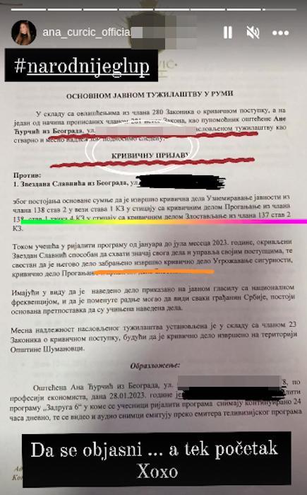 Bivša rijailiti takmičarka Ana Ćurčić svojevoljno je odlučila da javno obelodani detalje optužnice, i to putem društvene mreže Instagram:
