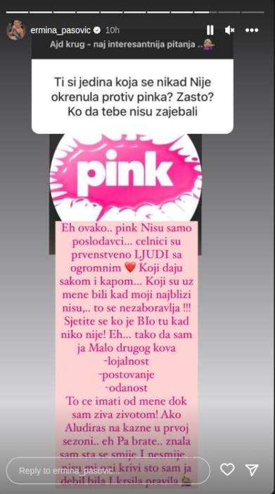 – “Pink” nisu samo poslodavci, čelnici su prvenstveno ljudi sa ogromnim srcem, koji daju šakom i kapom. Koji su uz mene bili kad moji najbliži nisu… to se ne zaboravlja! Setite se ko je bio tu, kad niko nije. Ja sam malo drugačijeg kova, lojalnost, poštovanje, odanost… To će imati od mene dok sam živa! Ako aludiraš na kazne u prvoj sezoni, eh pa brate, znala sam šta se sme a šta se ne sme, nisu mi oni krivi što sam ja debil bila i kršila pravila – poručila je Ermina.