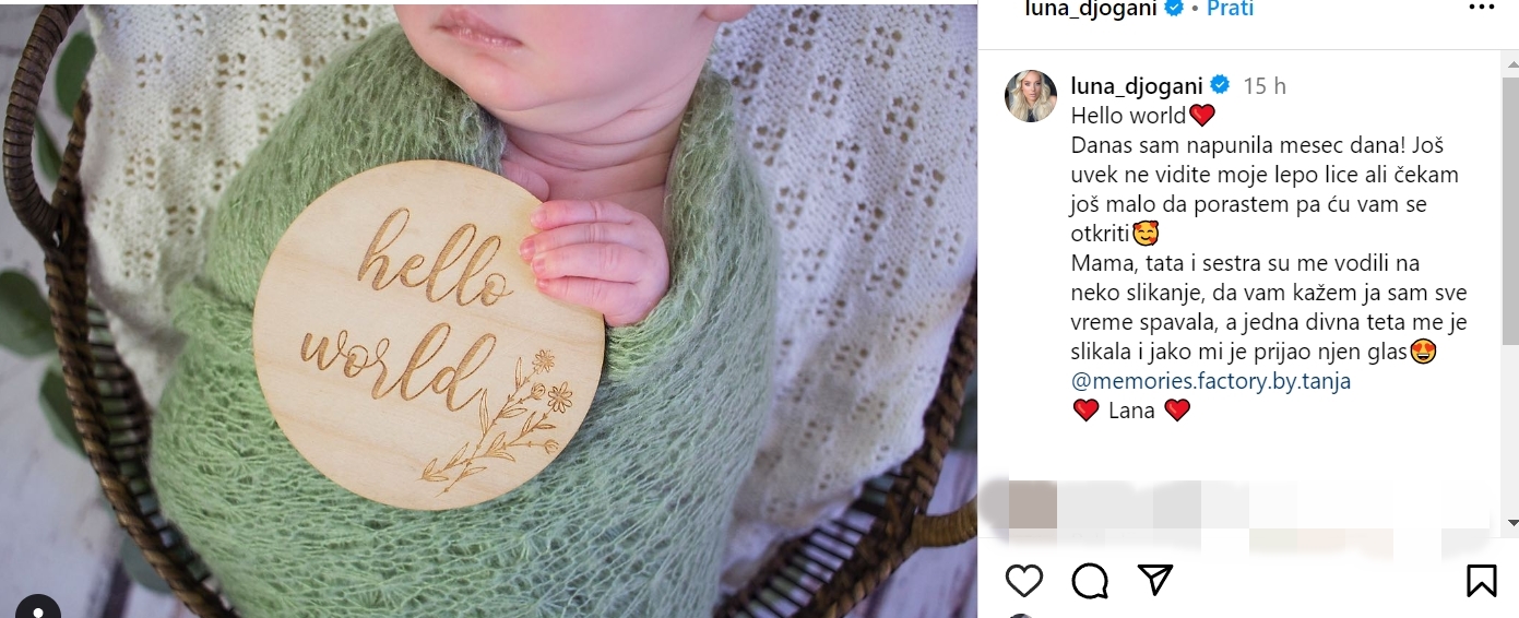 – Danas sam napunila mjesec dana! Još uvijek ne vidite moje lijepo lice ali čekam još malo da porastem pa ću vam se otkriti. Mama, tata i sestra su me vodili na neko slikanje, da vam kažem ja sam sve vreme spavala, a jedna divna teta me je slikala i jako mi je prijao njen glas. Lana – napisala je Luna u objavi, a ubrzo su usledili komentari oduševljenih pratilaca, a oglasila se i baka Anabela Atijas koja je napisala: “Lane moje lepo”, dok je na slici pisala poruka: “Zdravo svete”.