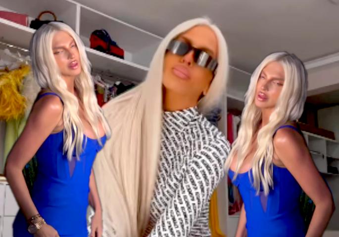 U svom nadaleko poznatom garderoberu, prepunom skupe i brendirane obuće, odeće, aksesoara i raznih modnih detalja, usnimila se dok je pozirala i ogledala se u ogledalu. Na sebi je imala srebrni stilizovani brushalter od metala, metalne čizme duge sve do kukova, predimenzionirane naočare i ultra minijaturnu suknju. Upravo je ta suknja bila “krivac” zbog kojeg su mnogi muškarci, pa i žene poludeli, našisto.