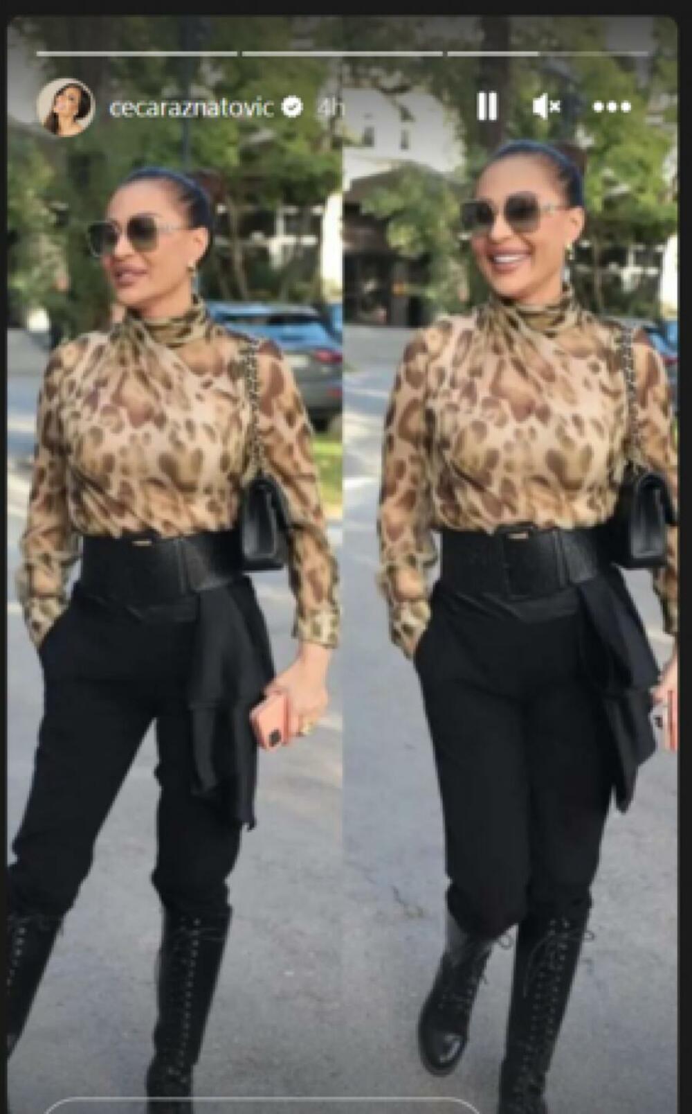 Duge čizme Ceca je kombinovala sa udobnim crnim pantalonama sa širokim crnim pojasom, a sve je razbila košuljom u animal printu.