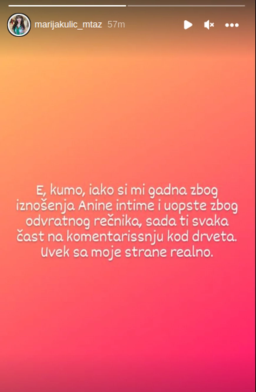 E kumo, iako si mi gadna zbog iznošenja Anine intime i uopšte zbog odvratnog rečnika, sada ti svaka čast na komentarisanju kod drveta. Uvek sa moje strane realno – rekla je Marija i iznenadile mnoge svojim stavom o Mileni Kačavendi.