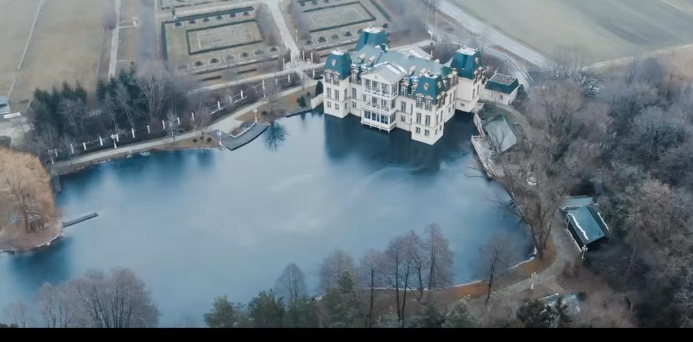 Iza velike crne ograde sa posebnim radom nalazi se prostrano dvorište, jezero i veliki beli dvorac sa plavim kupolama.