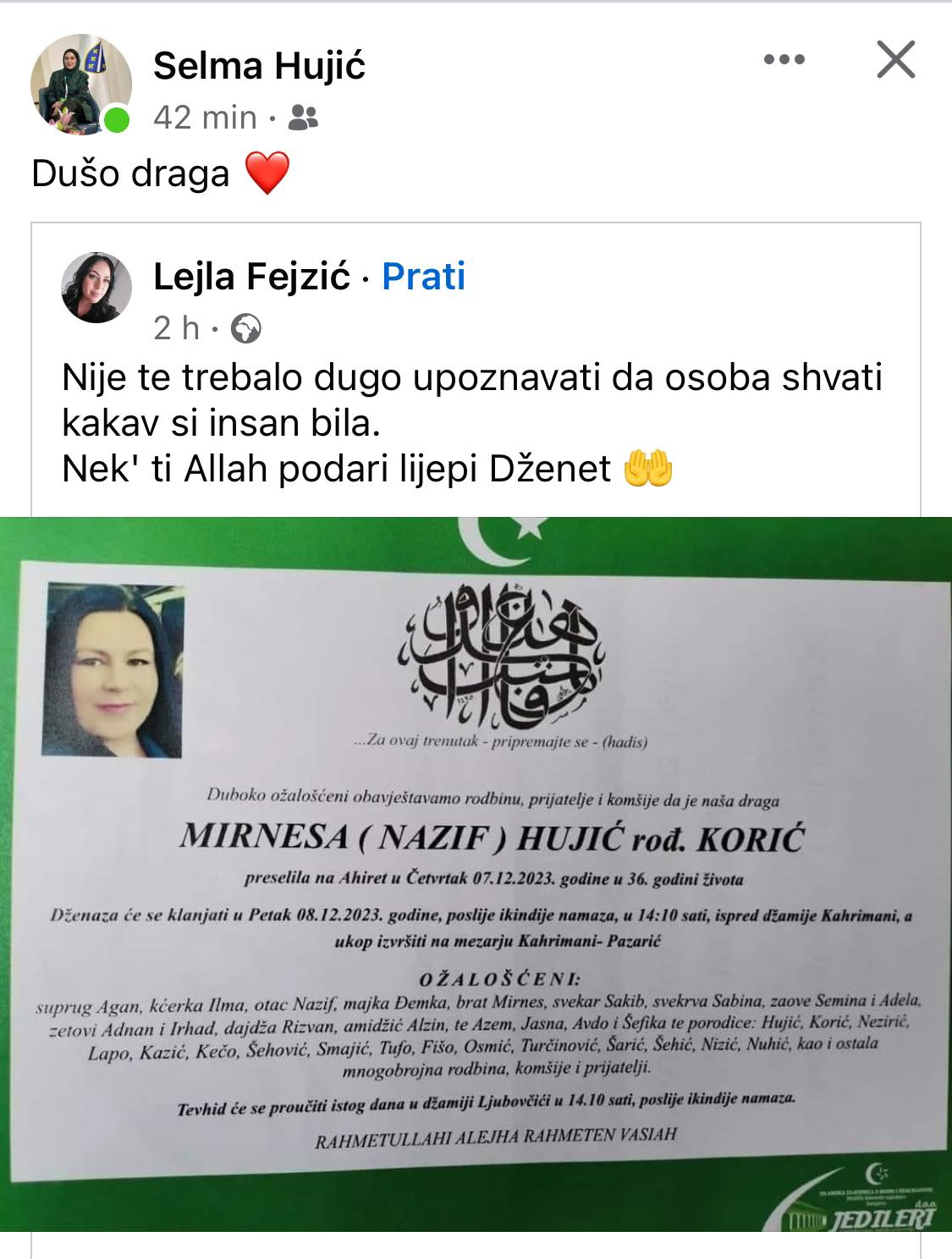 One koje su svoju tugu podijelile javno na svojim Facebook nalozima su Selma Hujić i Lejla Fejzić koja je uz Mirnesinu smrtovnicu napisala: