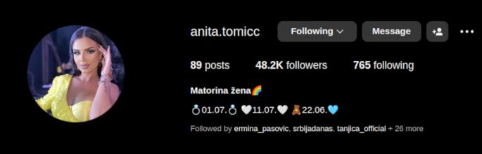 Ipak, na njenom Instagramu i dalje stoji prezime Tomić, a ispod imena je čak napisano i “Matorina žena”, što je Anita ponosno napisala nakon što se udala za Jovanu. Pored toga, sve slike sa Matorom su i dalje na Anitinom profilu, a da li će biti uklonjene ostaje da vidimo.