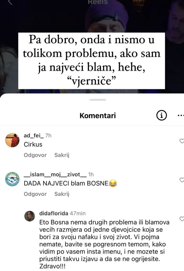 -Eto Bosna nema drugih problema ili blamova većih razmera od jedne devojčice koja se bori za svoj život. Vi pojma nemate, bavite se pogrešnom temom- glasio je jedan od komentara, a kako se čini ovakvu reakciju izazvao je video sa nastupa koji je Dada Mešaljić objavila.