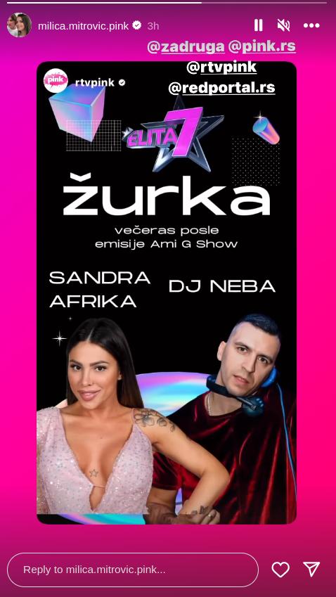 – Večeras posle emisije Amidži šou žurka sa Sandrom Afrikom i Dj Nebom – napisala je Milica MItrović na svom storiju na društvenoj mreži Instagram.