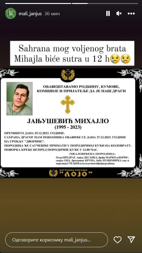 – Sahrana mog voljenog brata Mihaila biće sutra u 12h – napisao je Janjuš, a na spisku ožalošćenih nalaze se otac Predrag, majka Desanka, braća Marko i Boris, snajka Ena, bratanica Kruna, baka Punimirka…