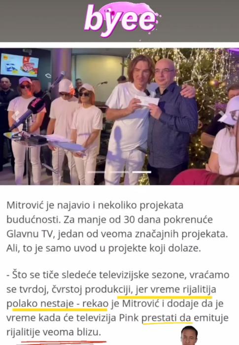 – Što se tiče sledeće televizijske sezone, vraćamo se tvrdoj, čvrstoj produkciji, jer vreme rijalitija polako nestaje – rekao je Mitrović i dodaje da je vreme kada će televizija Pink prestati da emituje rijalitije veoma blizu.