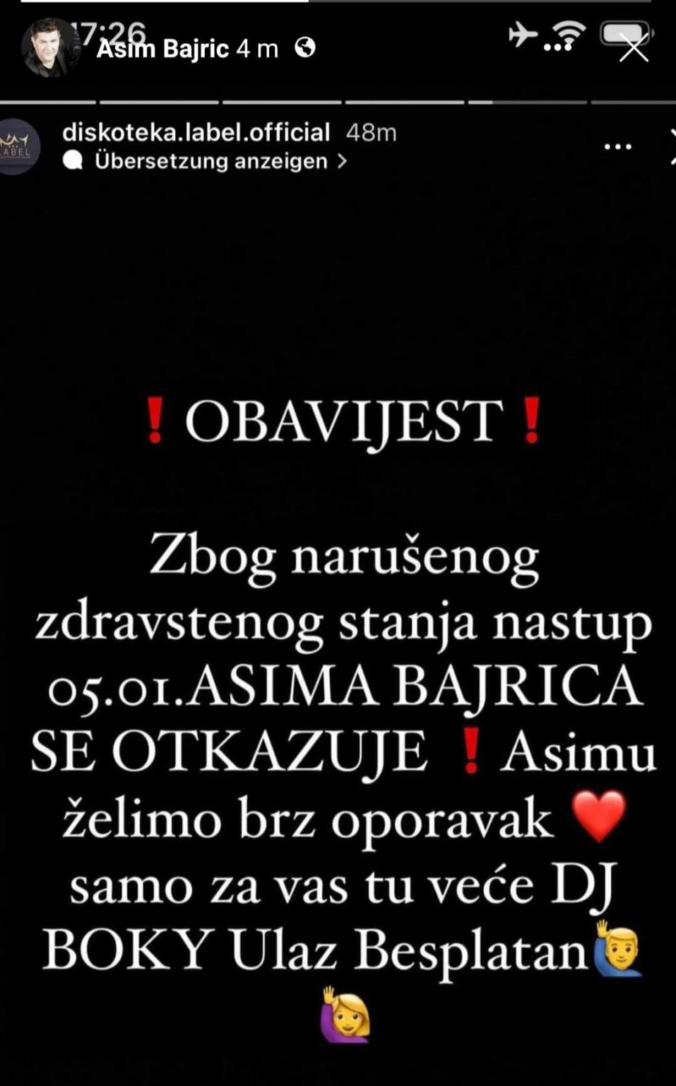 Oglasili su se i iz diskoteke u kojoj je Asim trebao pjevati: