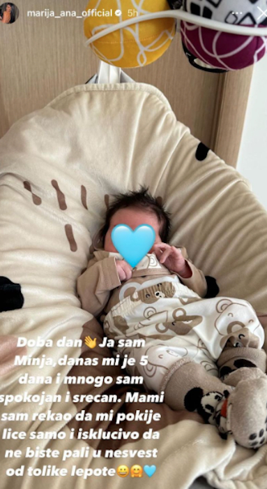 – Dobar dan, ja sam Minja. Danas mi je pet dana i mnogo sam spokojan i srećan. Mami sam rekao da mi pokrije lice samo i isključivo da ne biste pali u nesvest od tolike lepote – napisala je bivša zadrugarka, a dečaka vidimo kako uživa u ležaljki za bebe.