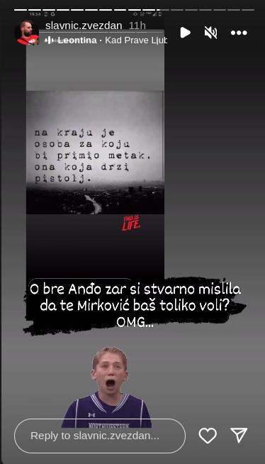 – O bre, Anđo, zar si stvarno mislila da te baš toliko voli? OMG (O moj Bože) – dopisao je Slavnić i dodao pesmu “Kad prave ljubavi ginu”, koju izvodi Leontina Vukomanović.