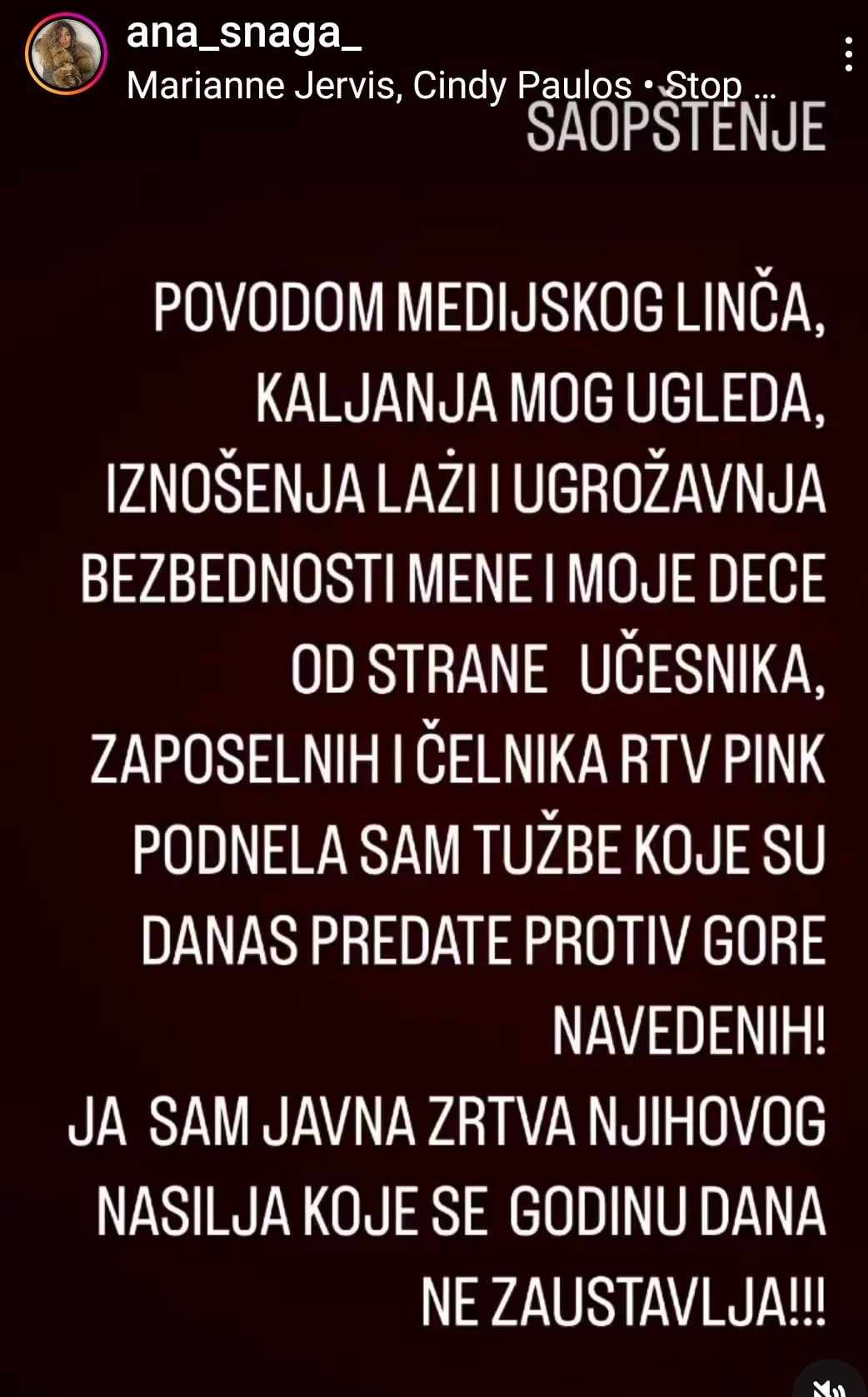 – Povodom medijskog linča i kaljanja mog ugleda, iznošenja laži i ugrožavanja bezbednosti mene i moje dece, od strane učesnika , zaposlenih i čelnika Pinka podnela sam tužbe koje su danas predate protiv gore navedenih. Ja sam žrtva njihovog nasilja koje traje već godinu dana – stoji u saopštenju.