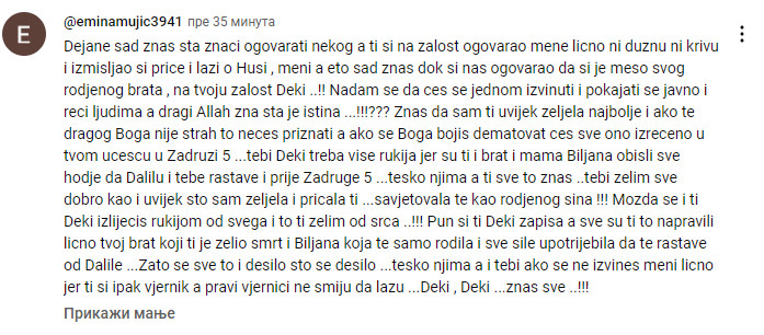 “Tebi Deki treba više rukija jer su ti i brat i mama Biljana obišli sve hodže da Dalilu i tebe rastave i pre teško njima a ti sve to znaš ..tebi želim sve dobro kao i uvek sto sam želela i pričala ti! Savetovala te kao rođenog sina !!! Možda se i ti Deki izlečis rukijom od svega i to ti želim od srca ..!!!”