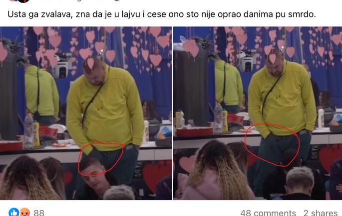 Na Fejsbuk stranici koja se bavi popularnim rijalitijem je isplivao skandalozni detalj, koji niko nije gledao blagonaklono. Na njemu se može videti zadrugar koji za crnim stolom odgovara na pitanja, a potom zavlači ruku kraj svog međunožja i bogato se trlja.