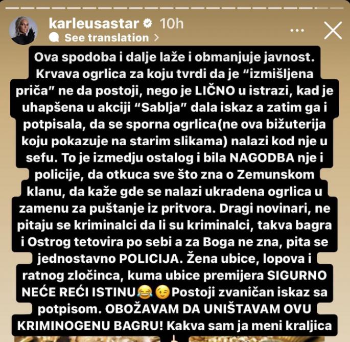 – SIGURNO NEĆE REĆI ISTINU. Postoji zvaničan iskaz sa potpisom. OBOŽAVAM DA UNIŠTAVAM OVU KRIMOGENU BAGRU! Kakva sam ja meni kraljica – napisala je Karleuša i dodala emotikon koji pokazuje srednji prst.