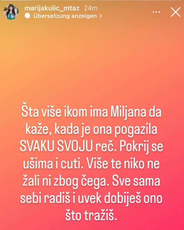 – Nisam protiv veze, nemam ništa protiv toga da se zezaju, druže, pa nek se i poljube, ali više od toga ne i napolju – ni slučajno! To može da bude dok traje rijaliti, posle toga ne. Nije narkoman, nije kockar, ali seje decu po svetu! Sve najgore je pričao o Sneži Kušadasi, izneo sav prljav veš. Kakva god da je… Ja nju mrzim, odvratna mi je zbog sestričine, što je dopustila da ode u hraniteljsku porodicu – zbog toga mi je odvratna, ali kakva god da je, ona ga je uvela, pružila mu šansu da zaradi ono što ne bi mogao napolju. Preko nje je ušao, to treba da poštuje, to važi i za Zolu i za onog skraćenog – izjavila je Marija Kulić juče.