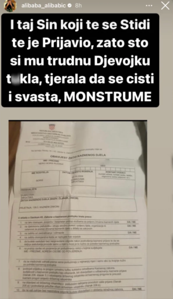 Naime, kako Asmin tvrdi, Sita je devojku svog sina naterala da abortira. To nije sve. Durdžić je objavio i navodni zapisnik, te istakao da je Sitin sin prijavio svoju majku zbog toga što mu je navodno pretukla devojku.