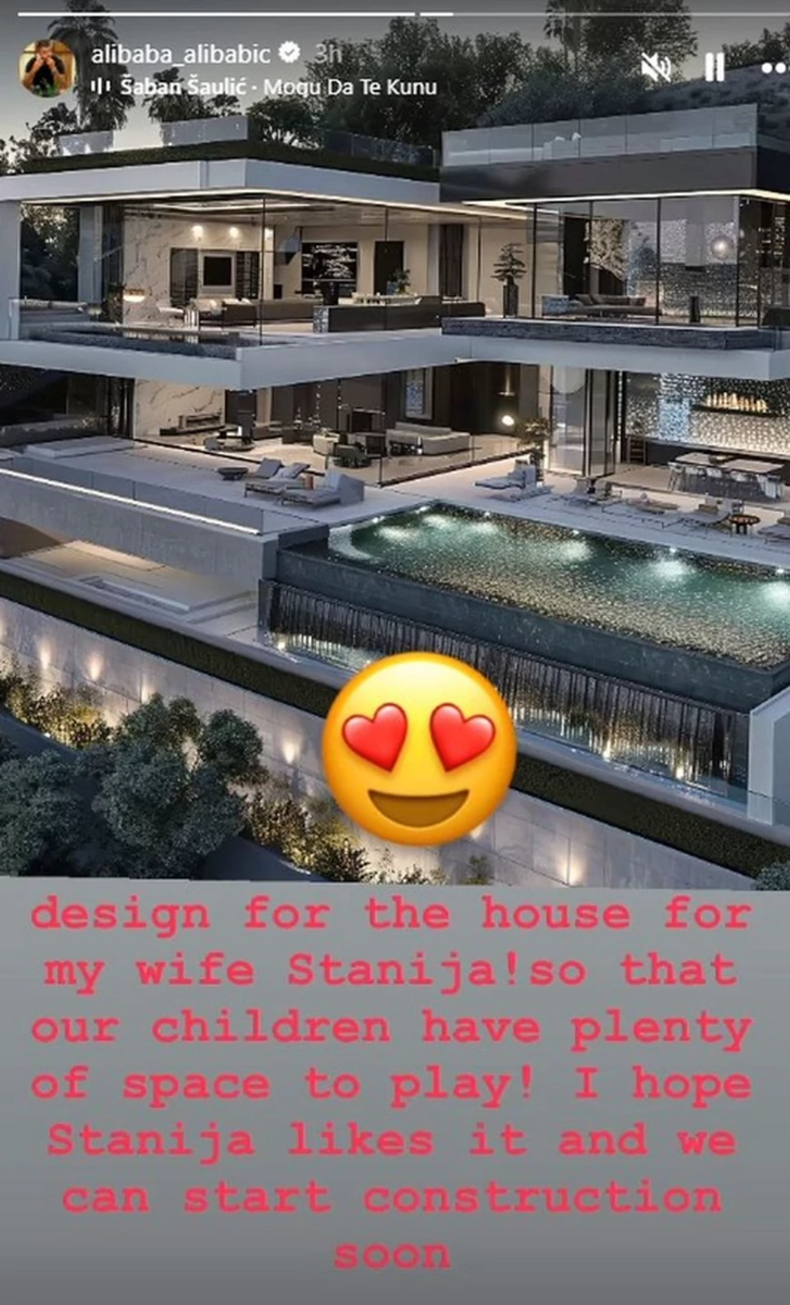 – Dizajn kuće za moju ženu Staniju. Naša deca će imati mnogo prostora za igranje. Nadam se sa će se Staniji svideti i da će uskoro početi radovi – napisao je Asmin u opisu fotografije na kojoj se vidi luksuzna višestpratnica koja je sva u staklu.