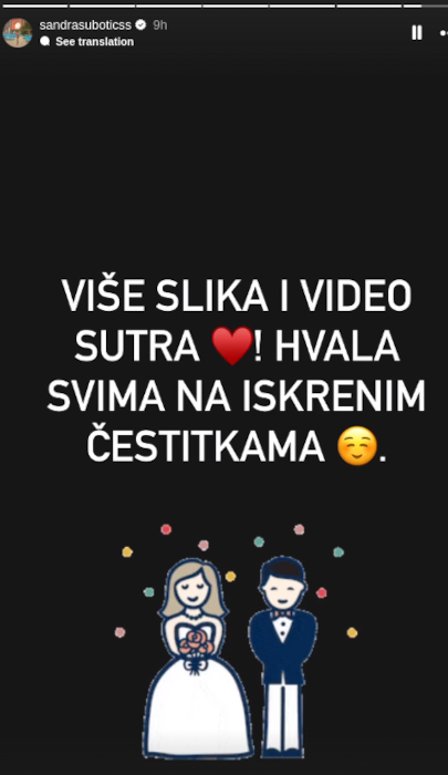 – Više slika i video sutra! Hvala svima na iskrenim čestitkama – poručila je bivša rijaliti učesnica uz emodži mlade i mladoženje, ali na fotografijama nigde ne vidimo pravog mladoženju, pa se nagađa da li je do venčanja zaista došlo ili je ovo samo još jedan potez Subotićeve kojim je želela da izazove pažnju javnosti.