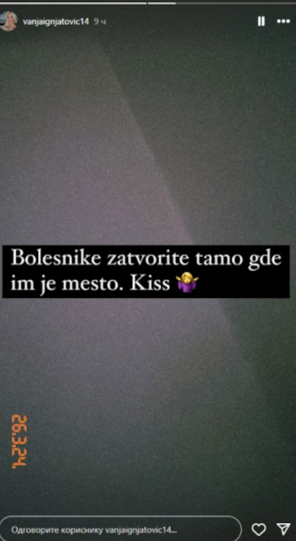 Bolesnike zatvorite tamo gde im je mesto. Kiss (poljubac) – napisala je Vanja putem svog Instagram profila, gde je poprilično aktivna i svakodnevno se oglašava.