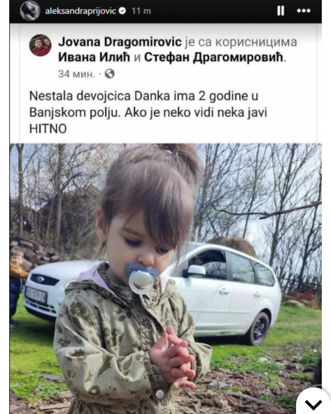 Pjevačica Aleksandra Prijović pred večerašnji koncert u Vršću, na Instagram profilu uputila je i objavila apel za potragu male Danke.