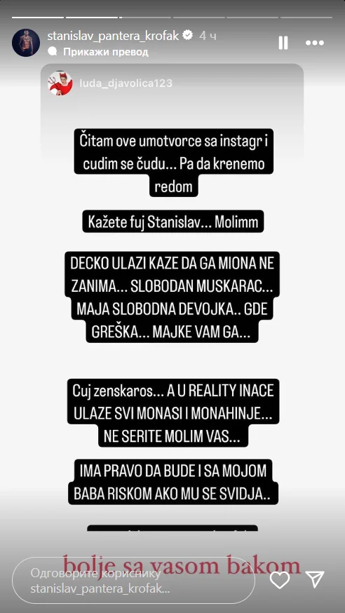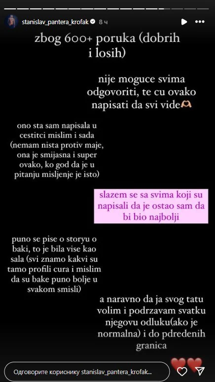 – Čitam ove umotvorce sa instagrama i čudim se čudu…Pa da krenemo redom. Kažete fuj Stanislav…Molim?! Dečko ulazi i kaže da ga Miona ne zanima, slobodan muškarac, Maja slobodna devojka, gde je greška?! Ima pravo da bude i sa mojom baba Riskom ako mu se sviđa – napisala je fan stranica, što je očigledno, s obzirom da ona vodi profil, njegova ćerka podelila na Stanislavovom Instagramu, istakavši: