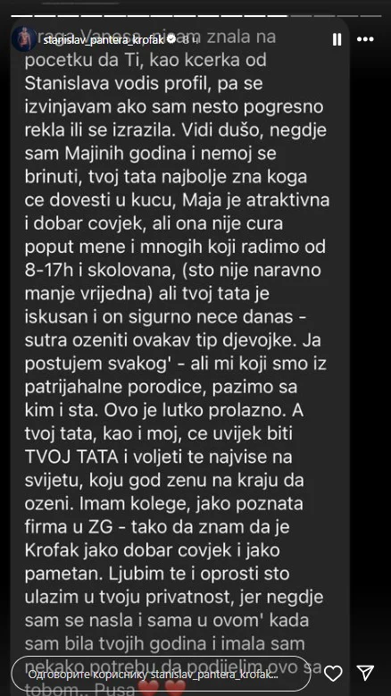 Maja je atraktivna i dobar čovek, ali tvoja tata je iskusan i on sigurno neće danas – sutra oženiti ovakav tip devojke. Ovo je lutko prolazno – napisala je između ostalog devojka a Stanislavova ćerka je podelila stori.