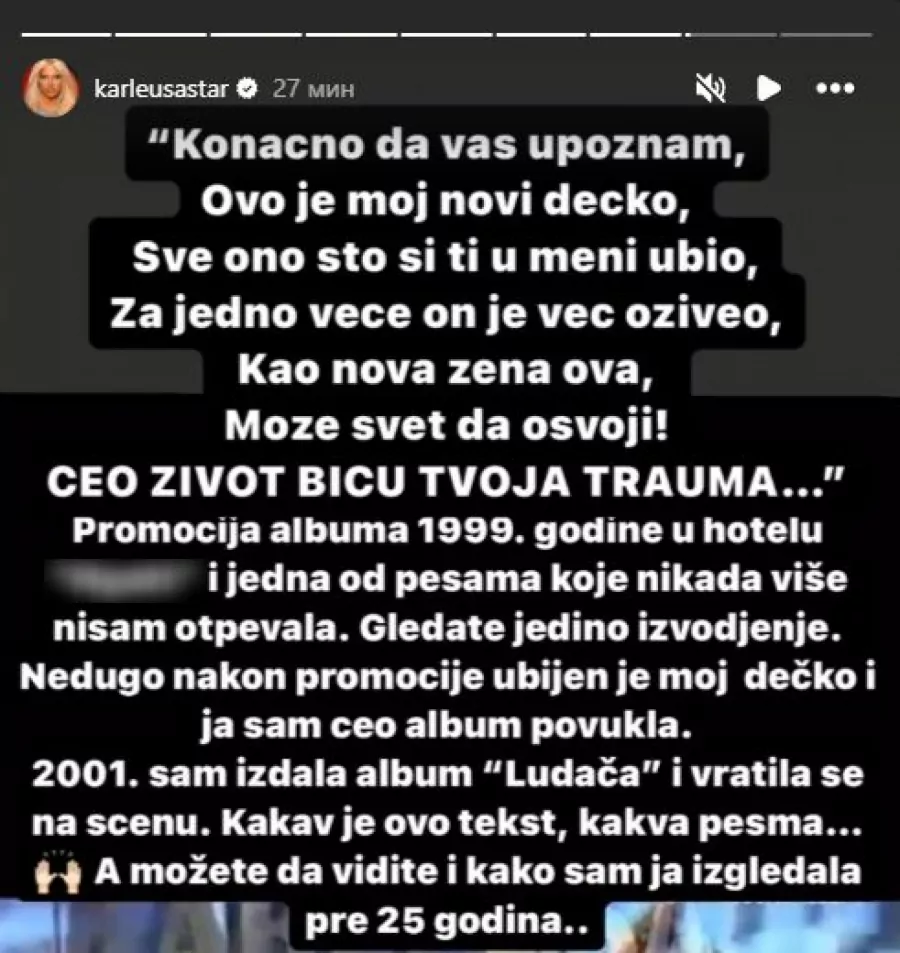 – „Konačno da vam upoznam, ovo je moj novi dečko, sve ono što si ti u meni ubio, za jedno veče on je već oživeo, kao nova žena ova, može ceo svet da osvoji! Ceo život biću tvoja trauma…“ Promocija albuma 1999. godine u hotelu i jedna od pesama koje nikada više nisam otpevala. Gledate jedino izvođenje. Nedugo nakon promocije ubijen je moj dečko i ja sam ceo album povukla. Godine 2001. sam izdala album „Ludača“ i vratila se na scenu. Kakav je ovo tekst, kakva pesma… A možete da vidite i kako sam izgledala pre 25 godina… – napisala je Jelena i po prvi put javno otkrila dosad nepoznate detalje iz života.
