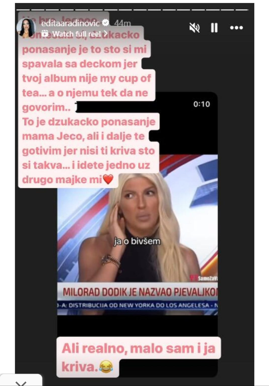 Onda se desio taj bezveze postupak, ja nemam problem sa egom do te mere. Neka ostane na ovome, svakako joj želim sve najbolje – izjavila je Edita na jednoj crnogorskoj televiziji.