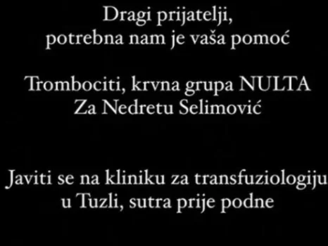 “Dragi prijatelji, potrebna nam je vaša pomoć. Trombociti, krvna grupa nulta, za Nedretu Selimović. Javiti se na kliniku za transfuziologiju sutra prije podne. Hvala vam”, napisao je Mirza putem svog Instagram profila.
