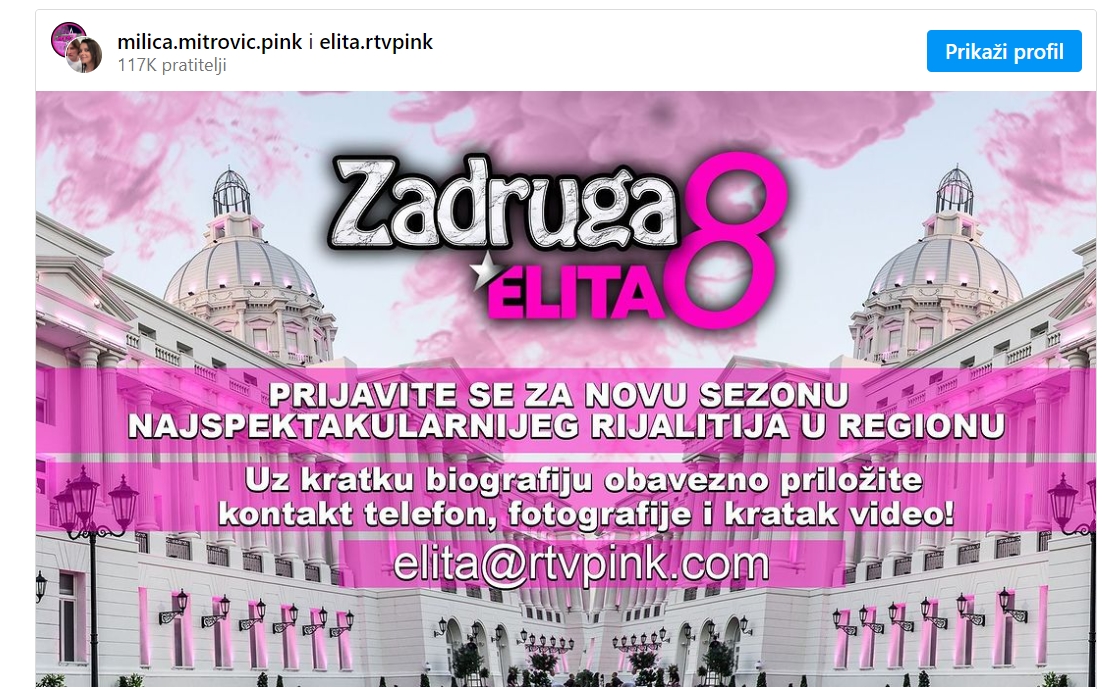 Milica Mitrović, direktorka zabavnog programa televizije Pink, oglasila se danas na društvenoj mreži Instagram, te otkrila da počinje konkurs za nove učesnike osme sezone rijalitija “Elita”.