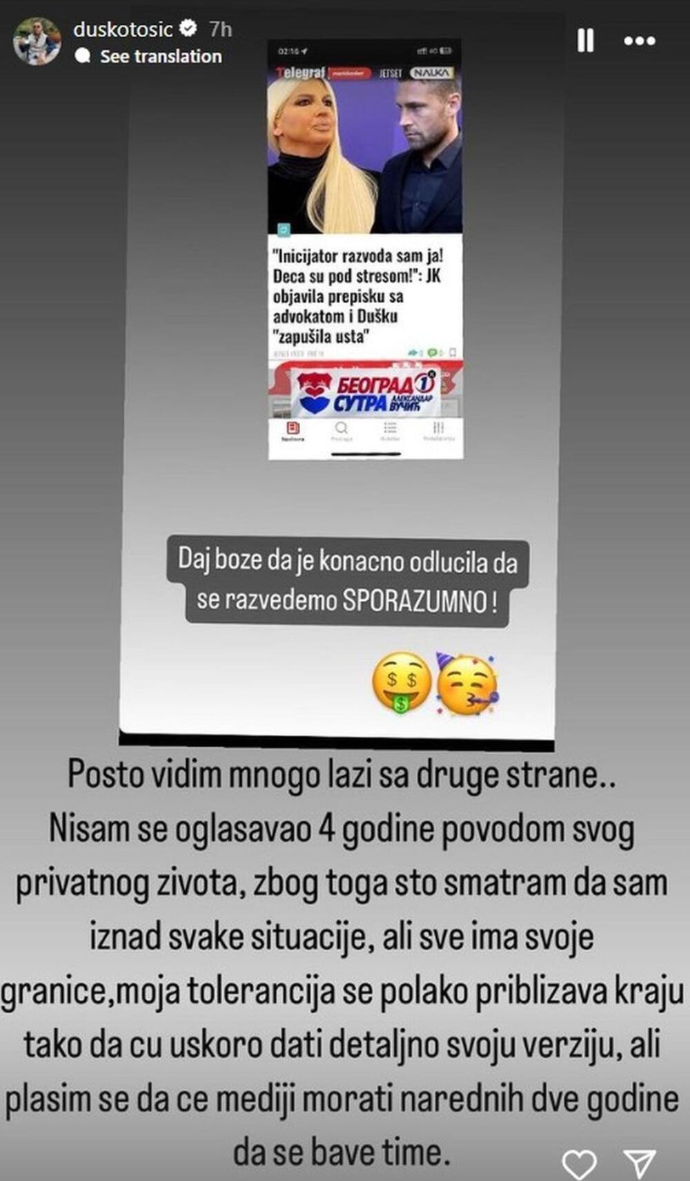 – Pošto vidim mnogo laži sa druge strane… Nisam se oglašavao 4 godine povodom svog privatnog života, zbog toga sto smatram da sam iznad svake situacije, ali sve ima svoje granice, moja tolerancija se polako približava kraju tako da ću uskoro dati detaljno svoju verziju, ali plasim se da će mediji morati narednih dve godine da se bave time – napisao je Tošić.