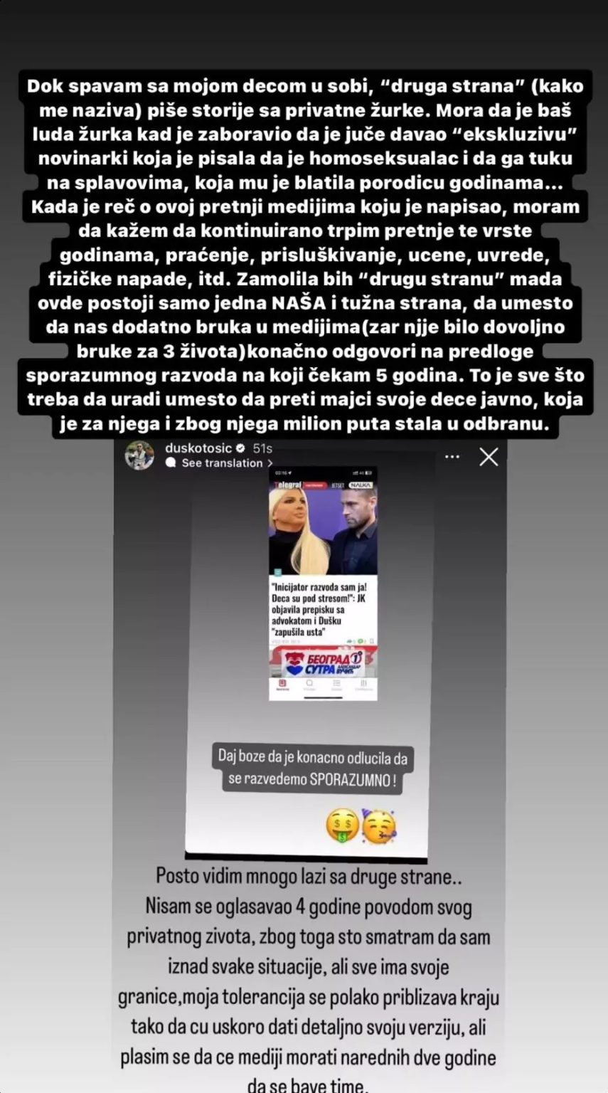 – Dok spavam sa mojom decom u sobi, “druga strana” (kako me naziva) piše storije sa privatne žurke. Mora da je baš luda žurka kad je zaboravio da je juče davao “ekskluzivu” novinarki koja je pisala da je homo****ualac i da ga tuku na splavovima, koja mu je blatila porodicu godinama… Kada je reč o ovoj pretnji medijima koju je napisao, moram da kažem da kontinuirano trpim pretnje te vrste godinama, praćenje, prisluškivanje, ucene, uvrede, fizičke napade, itd. Zamolila bih “drugu stranu” mada ovde postoji samo jedna NAŠA i tužna strana, da umesto da nas dodatno bruka u medijima (zar nije bilo dovolino bruke za 3 života) konačno odgovori na predloge sporazumnog razoda na koji čekam 5 godina. To je sve što treba da uradi umesto da preti majci svoje dece javno, koja je za njega i zbog njega milion puta stala u odbranu.