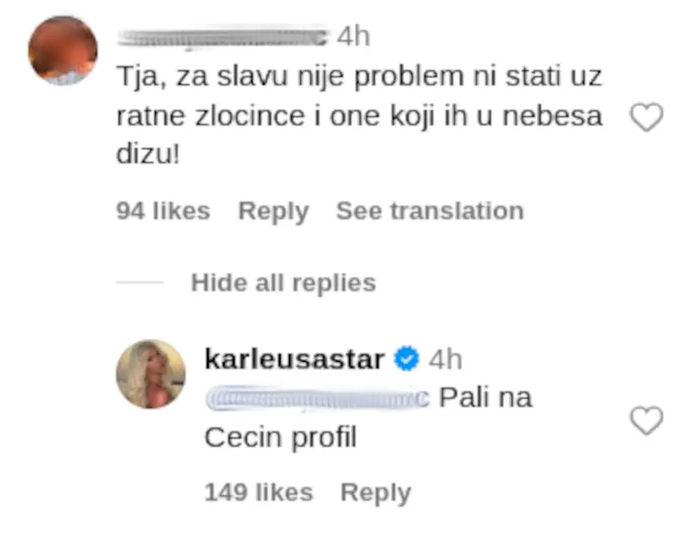 – Za slavu nije teško stati ni uz ratne zločince i uz one koji ih u nebesa dižu – napisala je jedna korisnica Instagrama, a Karleuša joj je brutalno odgovorila: