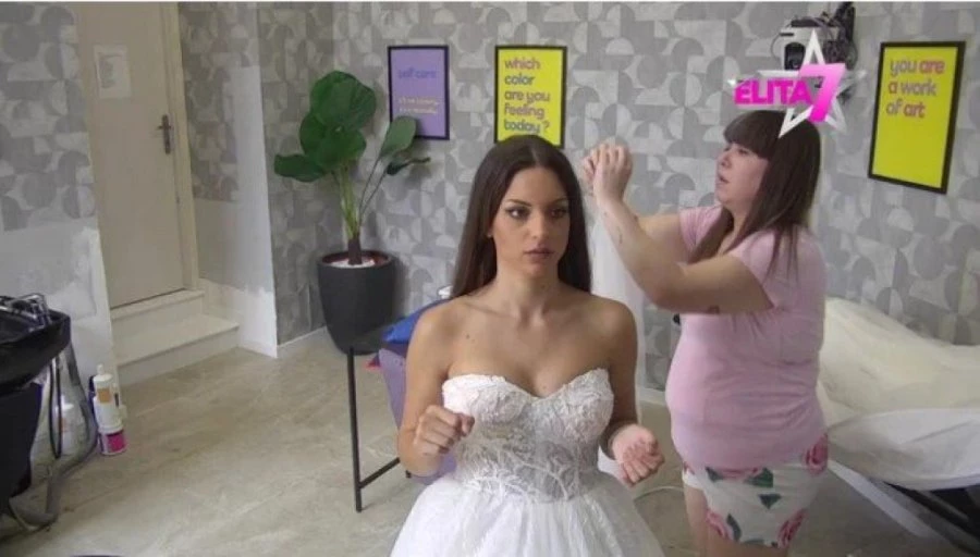 Učesnica rijalitija Elita Miona Jovanović probala je danas prvi put venčanicu, te je birala između dve toalete, kako bi se na kraju odlučila i presekla koju će nositi na svadbi sa Stanislavom Krofakom.