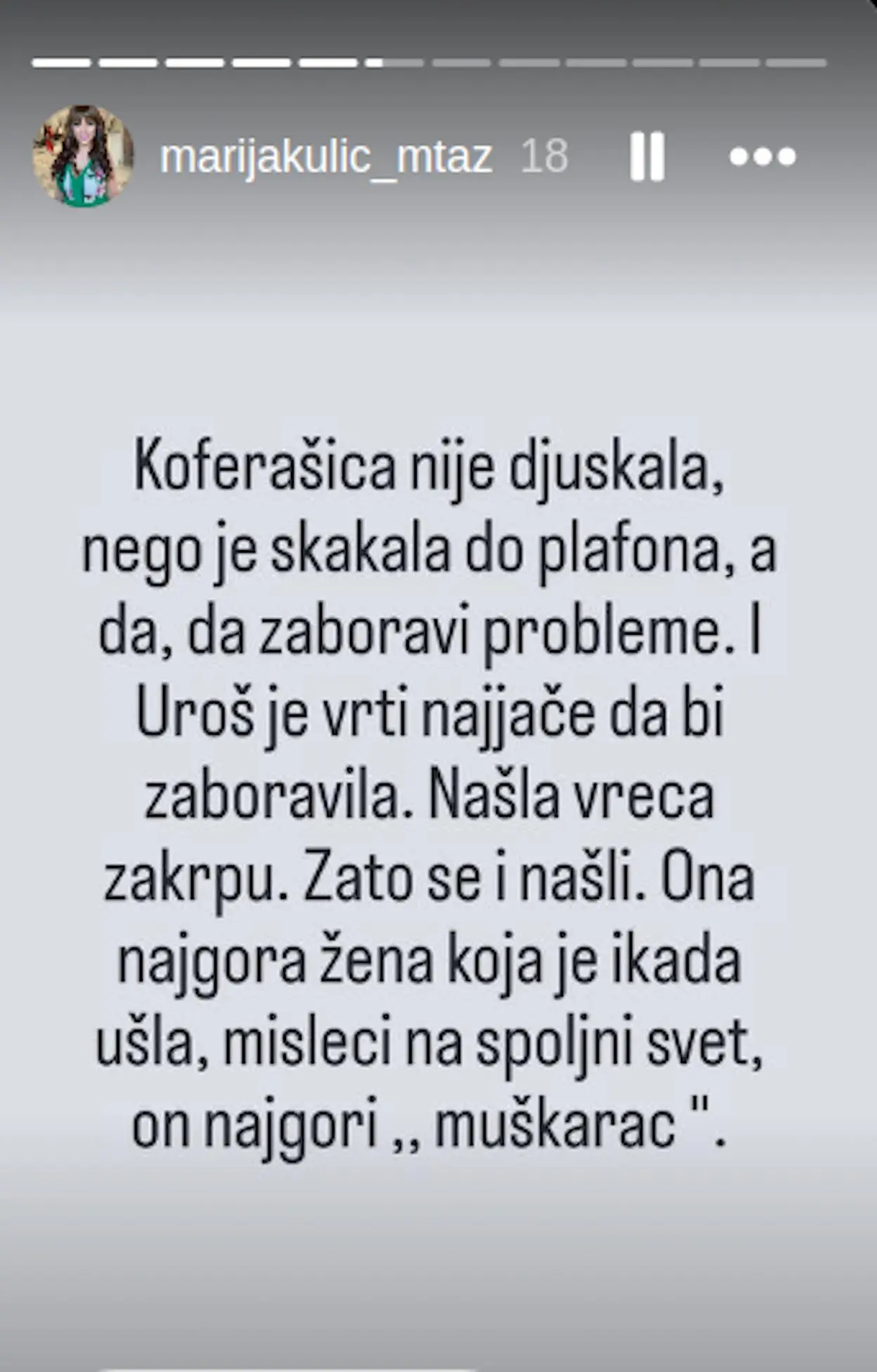 – Koferašica nije đuskala, nego je skakala do plafona, a da, da zaboravi probleme. I Uroš je vrti najjače da bi zaboravila. Našla vreća zakrpu. Zato se i našli. Ona najgora žena koja je ikada ušla, misleći na spoljni svet. On najgori muškarac – napisala je Marija Kulić.