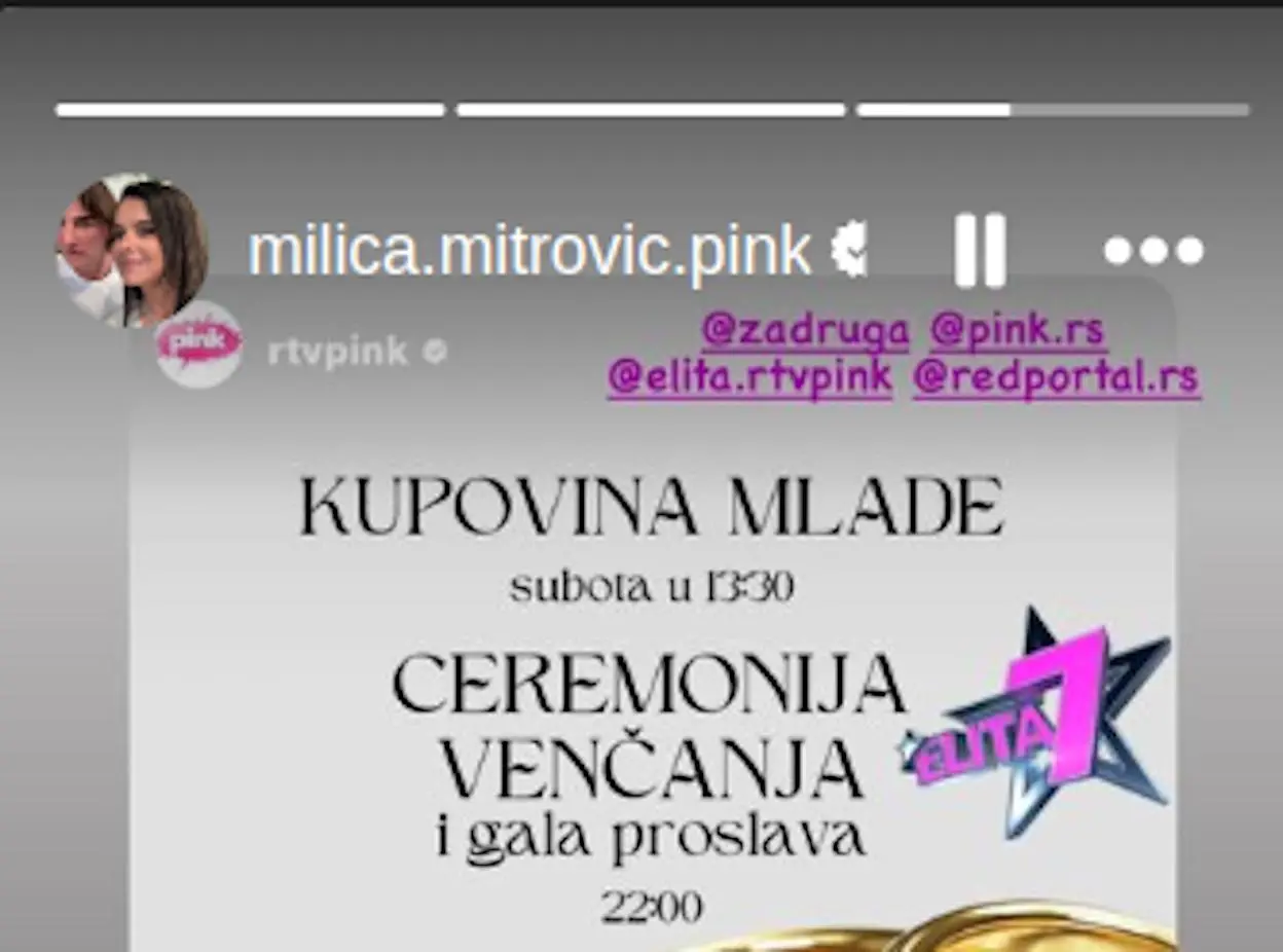 Naime, u subotu 29. juna nas očekuje neverovatno rijaliti venčanje bivših partnera – Stanislava Krofaka i Mione Jovanović. Mitrovićeva je detalje i satnicu podelila na svom zvaničnom Instagram nalogu. Njihovo venčanje, koje se već uveliko priprema, obećava da bude jedan od ključnih i najgledanijih trenutaka sedme sezone „Elite“.