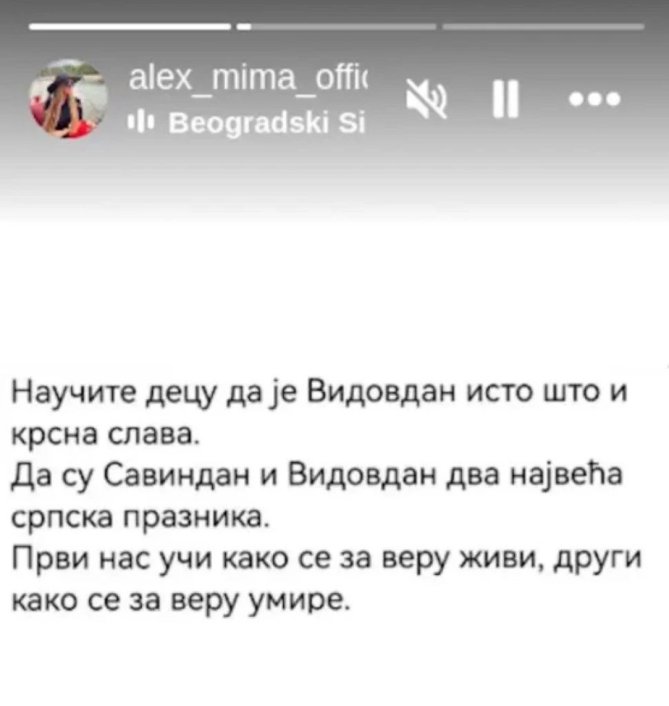 Naučite decu da je Vidovdan isto što i krsna slava , da su Savindan i Vidovdan dva najveća srpska praznika. Prvi nas uči kako se za veru živi, a drugi kako se za veru umire – objavila je Aleks Nikolić i na ovaj način jasno poručila da će Leona da se vaspitava u duhu srpske pravoslavne tradicije, jer rimokatolička tradicija ne poznaje ni Savindan, a ni Vidovdan.