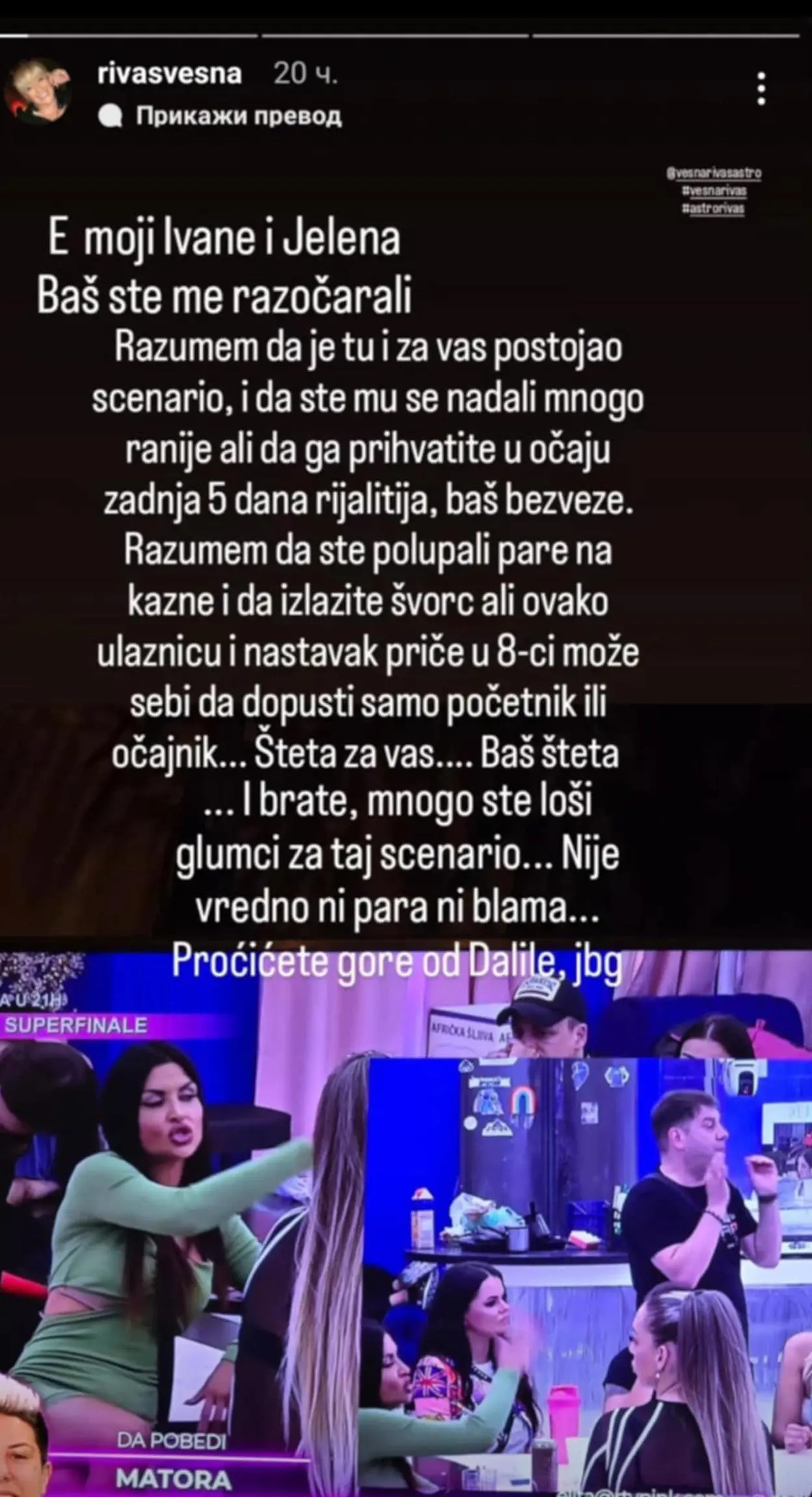 – E, moji Ivane i Jelena, baš ste me razočarali. Razumem da je tu za vas postojao scenario, gde ste mu se nadali mnogo ranije, ali da ga prihvatite u očaju, zadnji pet dana rijalitija, baš bezveze. Razumem da ste polupali pare na kazne i da izlazite švorc, ali ovako ulaznicu i nastavak priče u “osmici” može samo sebi da dopusti početnik ili očajnik – piše Vesna Rivas na Instagramu, pa dodaje: