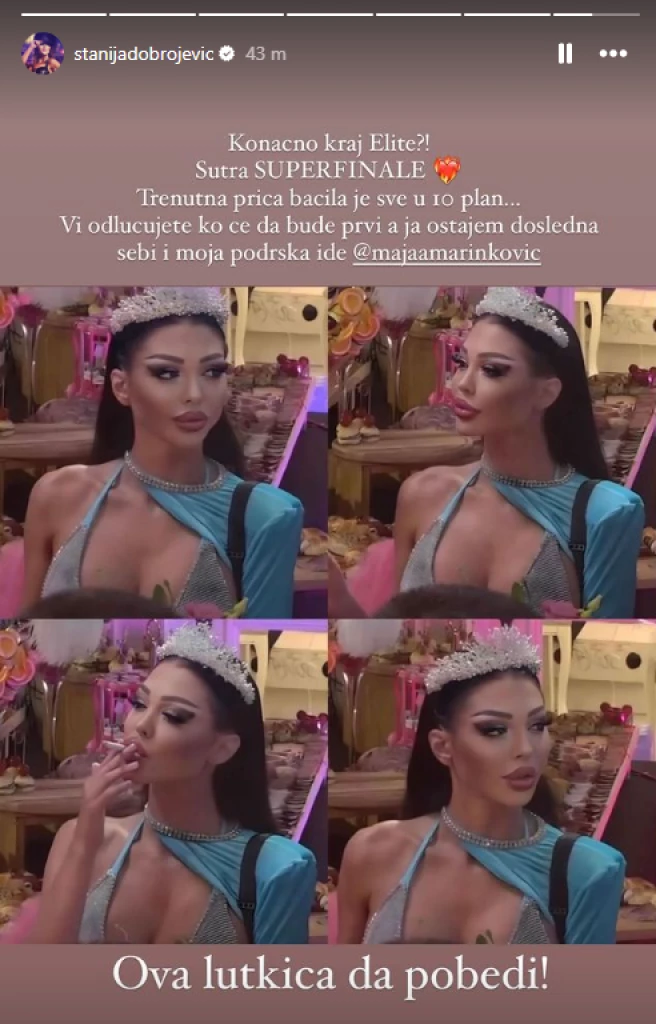 – Konačno kraj Elite?! Sutra superfinale! Trenutna priča bacila je sve u 10 plan. Vi odlučujete ko će da bude prva, a ja ostajem dosledna sebi i moja podrška ide Maji Marinković! Ova lutkica da pobedi – napisala je Stanija Dobrojević na Instagram storiju.