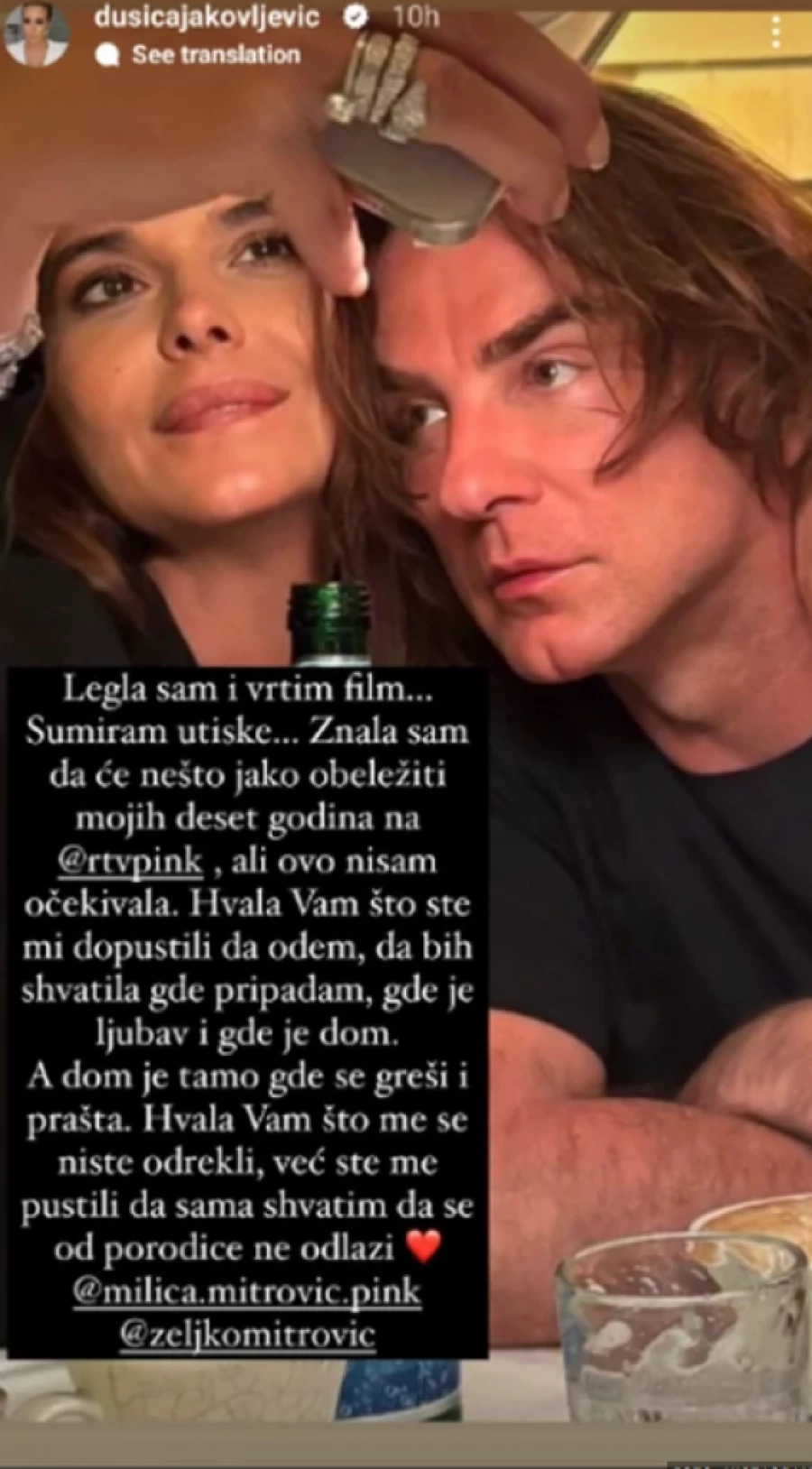 -Legla sam i vrtim film, sumiram utiske… Znala sam da će nešto jako obeležiti mojih 10 godina na TV Pink, ali ovo nisam očekivala. Hvala vam što se mi dopustili da odem, da bih shvatila gde pripadam, gde je ljubav i gde je dom. A dom je tamo gde se greši i gde se prašta. Hvala vam što me se niste odrekli, već ste me pustili da sama shvatim da se od porodice ne odlazi – napisala je ona.